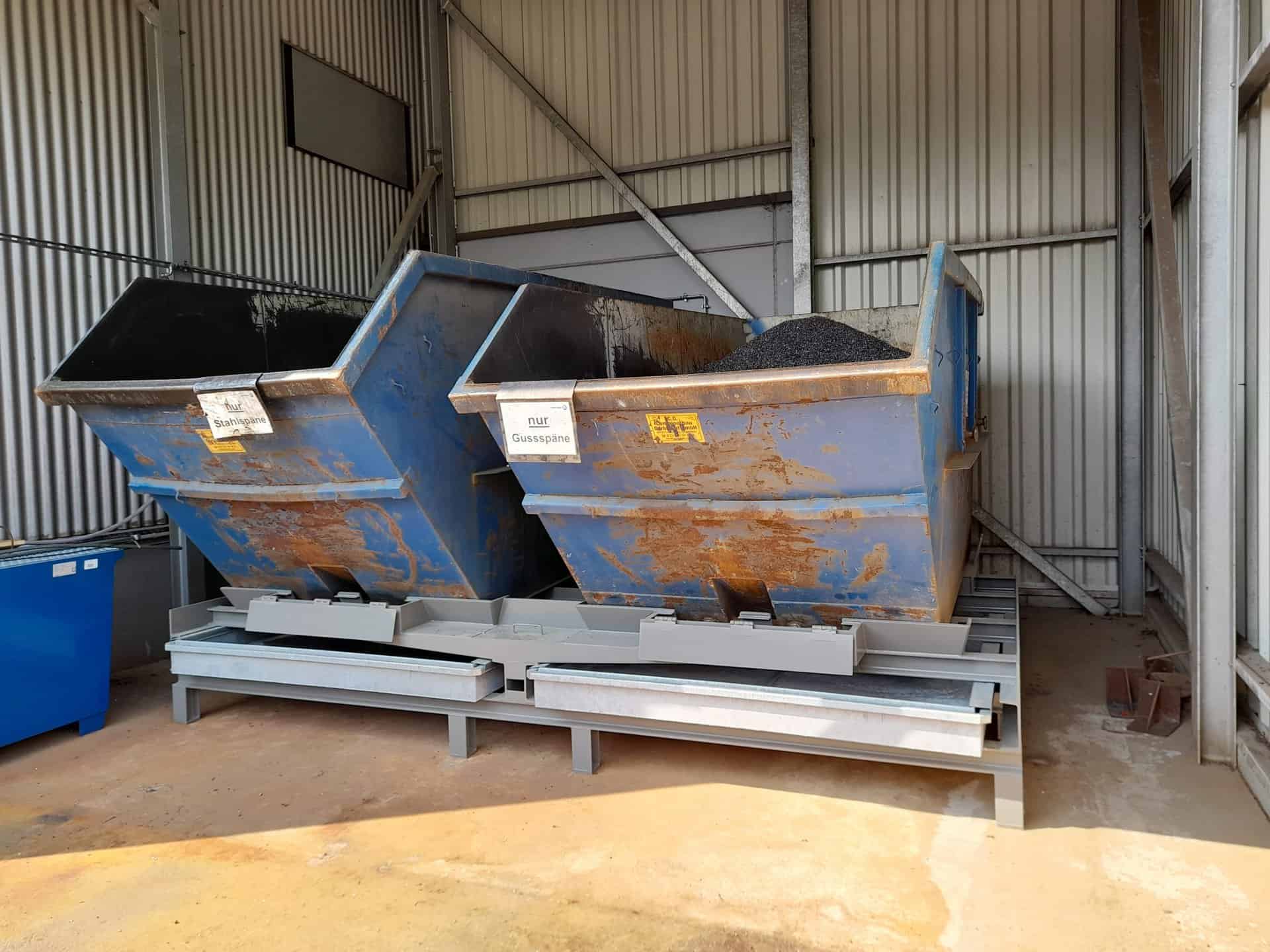 Die durchdachte Konstruktion ermöglicht eine komfortable Positionierung und Entnahme der beiden Absetzmulden bis 16 m³. Gleichzeitig sorgt die geschlossene, für den überdachten Einsatz optimierte Ausführung dafür, dass der Auffangbereich dauerhaft kontrollierbar und übersichtlich bleibt. So wird eine sichere, saubere und regelkonforme Vordach- oder Hallenlagerung von Metallspänen gewährleistet.